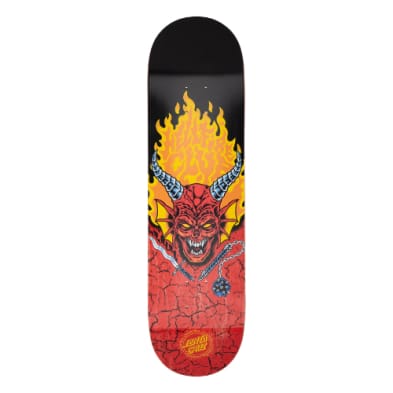 The Santa Cruz Stranger Things Hellfire Club 8.25in x 31.80in deck features multicolor glow in the dark graphics on Santa Cruz’s popular 8.25 shape.